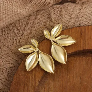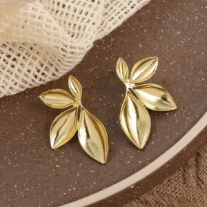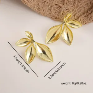 Elegant 14K Golden Plated Leaf Design Stud Earrings for Women, Simple Zinc Alloy Ear Studs for Daily & Party Wear, No Mosaic Material – Pair